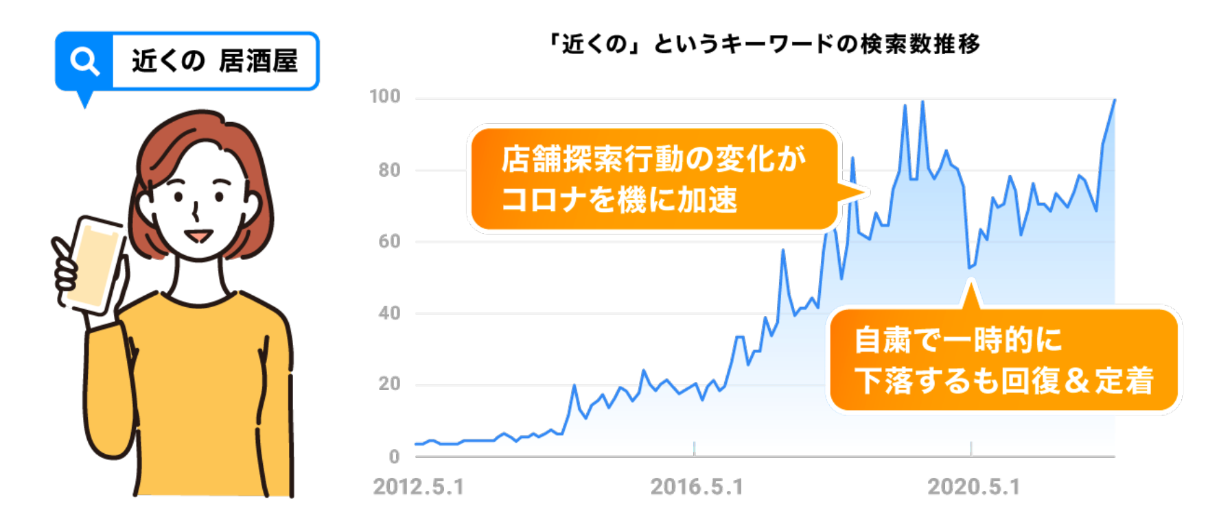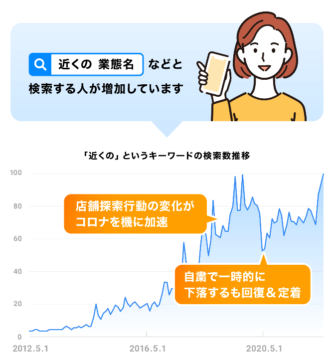 昨今、Googleでの検索において「近くの+業態名」などと検索するユーザーが増加しています。