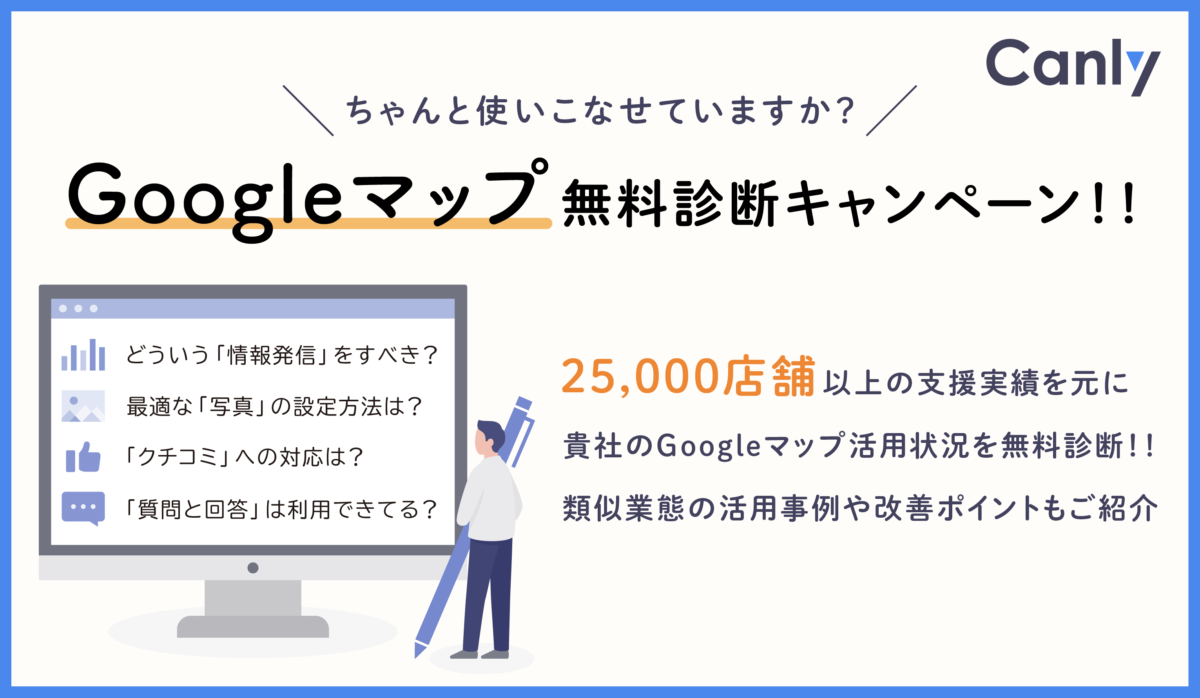 今回のキャンペーンでは、25,000店舗以上の運用支援実績を持つGoogleマップ活用のプロ・カンリーが、あなたの店舗のGoogleマップ画面を一緒に見ながら活用状況を診断し、問題の発見、解決策の検討を類似業態の事例を交えてご紹介させて頂きます。